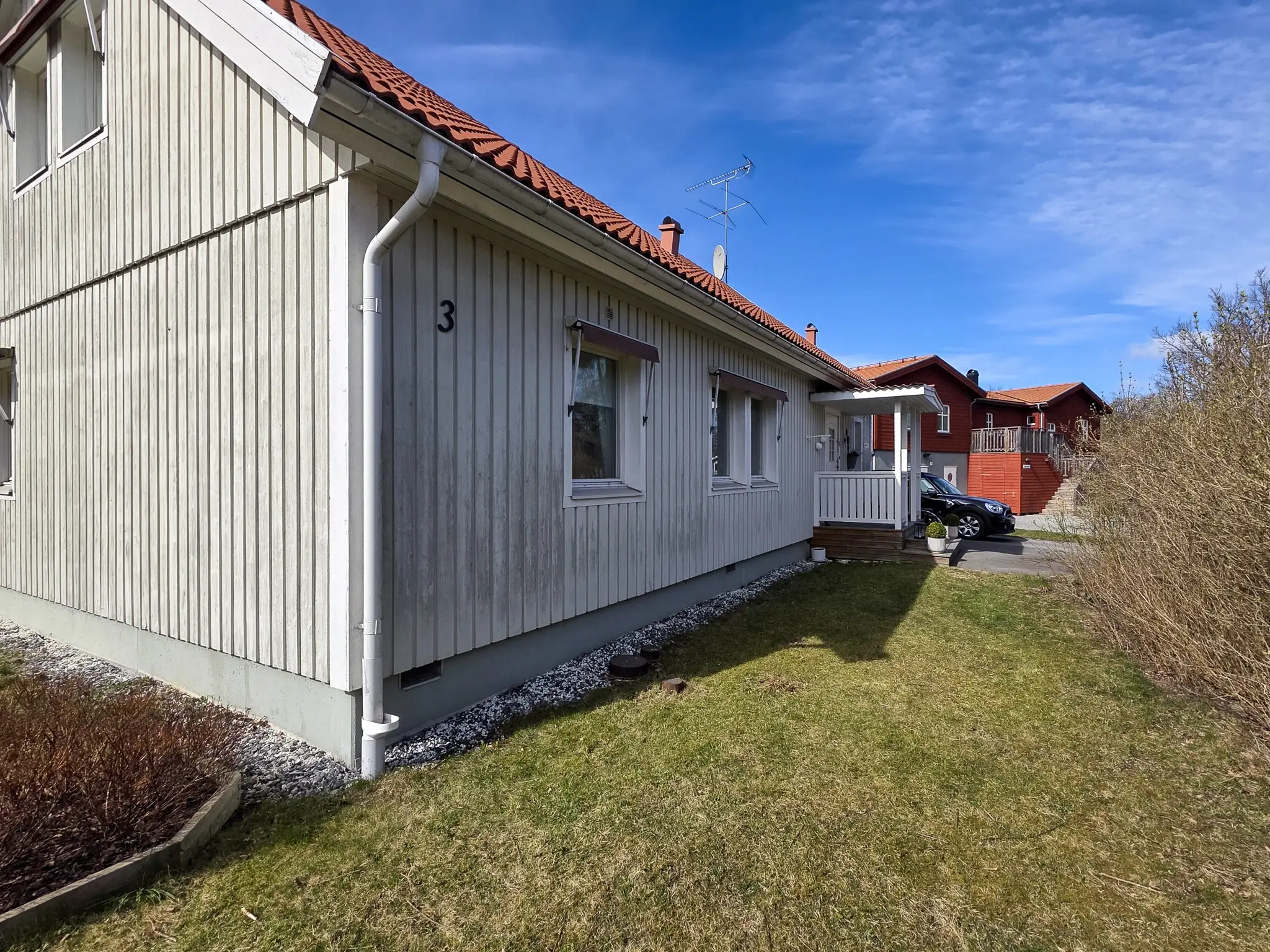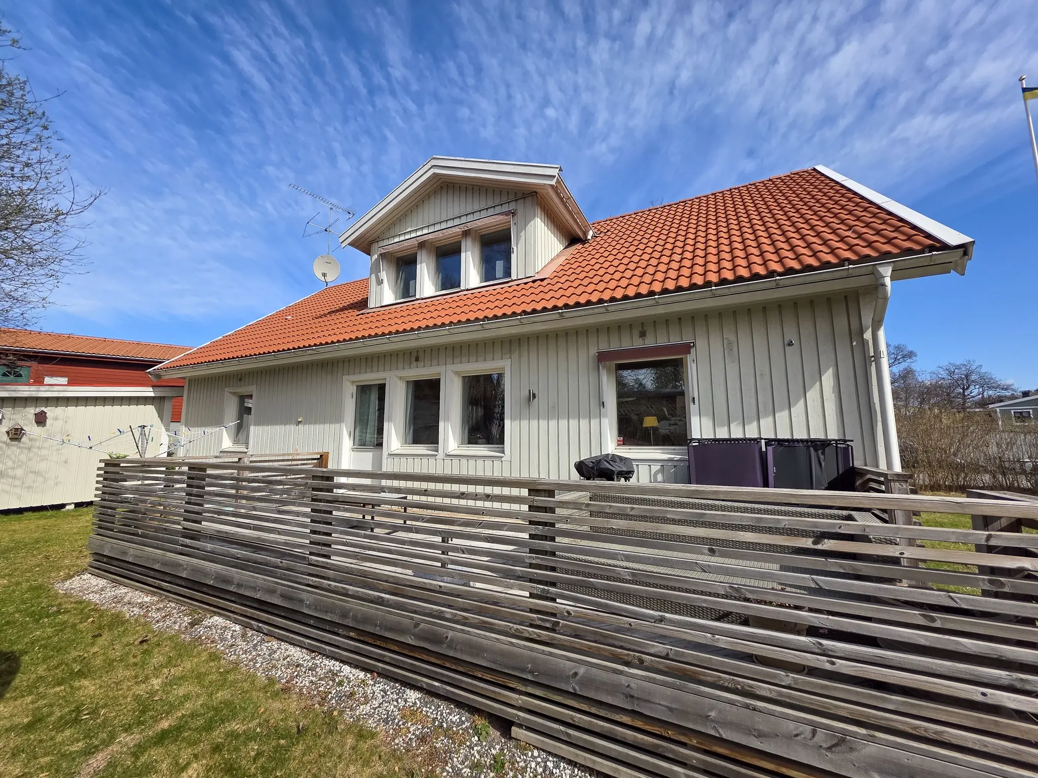 Vi började med noggrann tvättning och skrapning av hela fasaden för att skapa bästa möjliga grund. Sedan målade vi hela fasaden med två strykningar. På kundens begäran bytte vi även ut vindskivorna på ena gaveln, och målade även dessa. Utöver det målade vi även entrén med undertak och staket för en helhetslösning.
