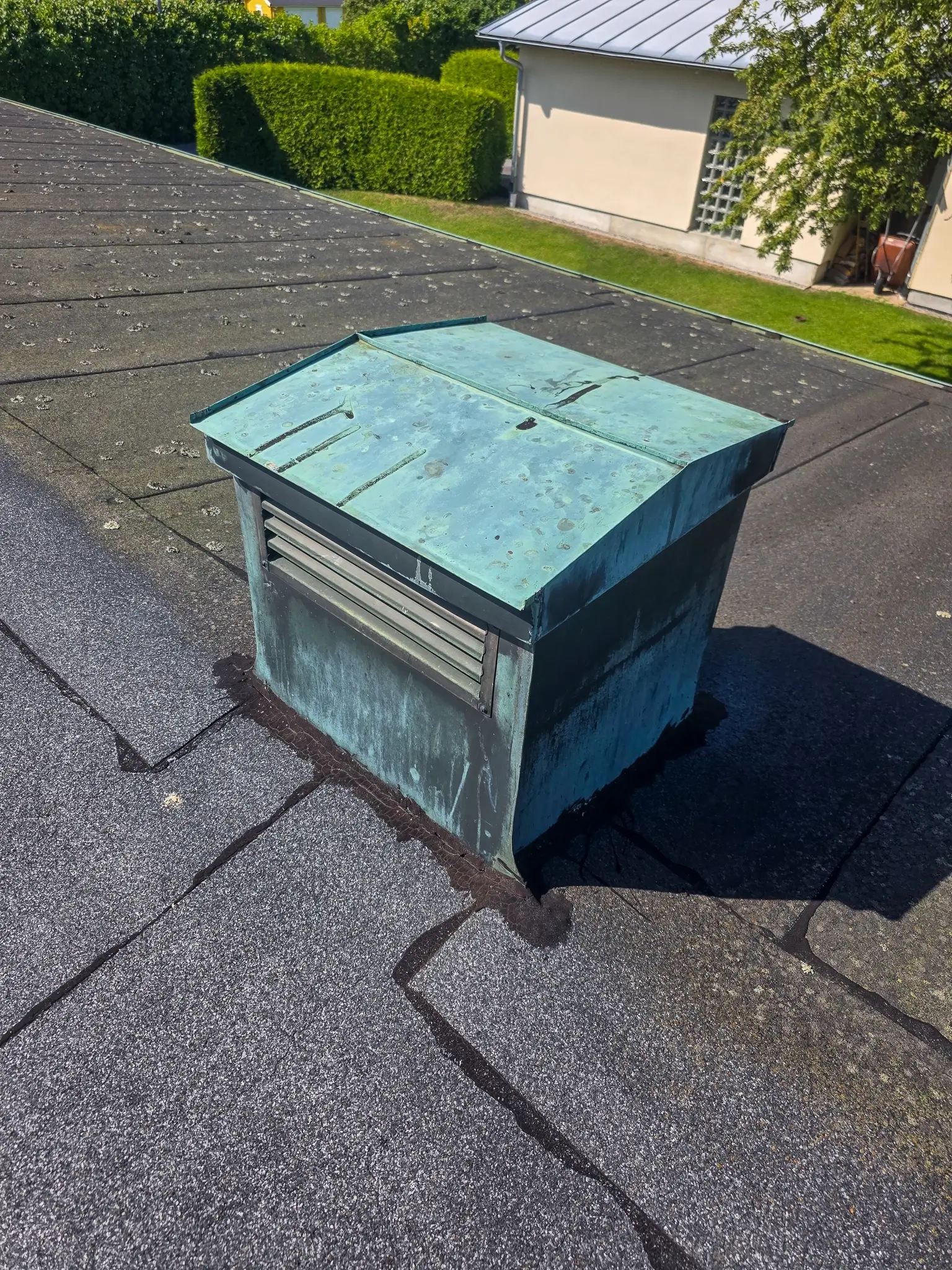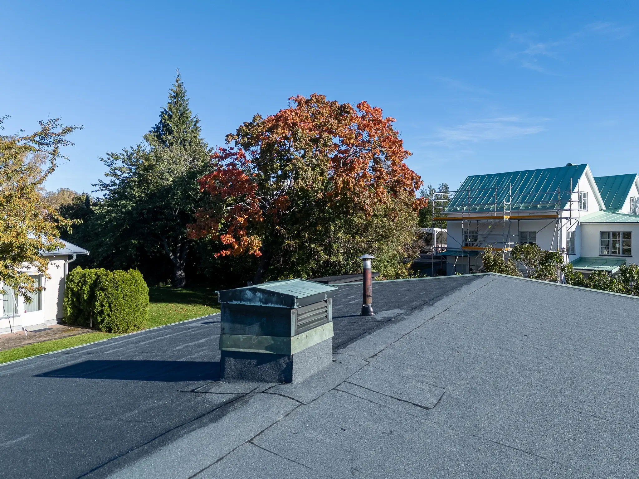 På hustaket skrapade vi bort det gamla ytpappet och monterade nytt svetsad Monomax ytpapp över hela takytan på 225 kvm. Krönplåtar och tätningslister i koppar monterades runt alla genomföringar, vilket tidigare hade saknats. Detta ger både ett elegant uttryck och säkerställer att taket är tätt och skyddat mot framtida fuktproblem.